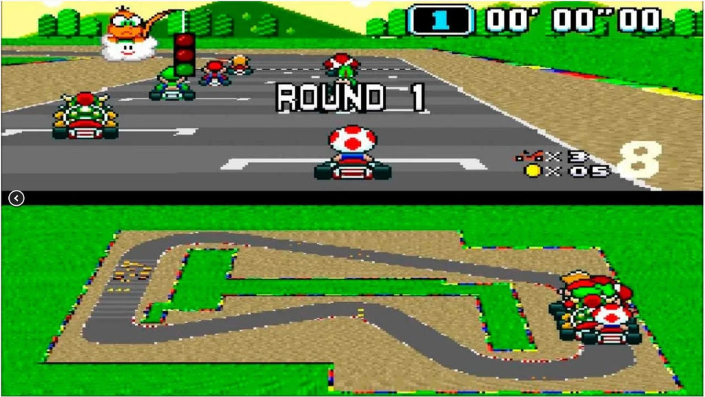 Super Mario Kart é um jogo de corrida para o Super Nintendo Entertainment System e o primeiro jogo da série Mario Kart. No modo singleplayer, os jogadores podem correr contra personagens da série Mario em copas de multi-corridas ao longo de três níveis de dificuldade. Durante as corridas, power-ups ofensivos e de aumento de velocidade podem ser usados para ganhar vantagens.